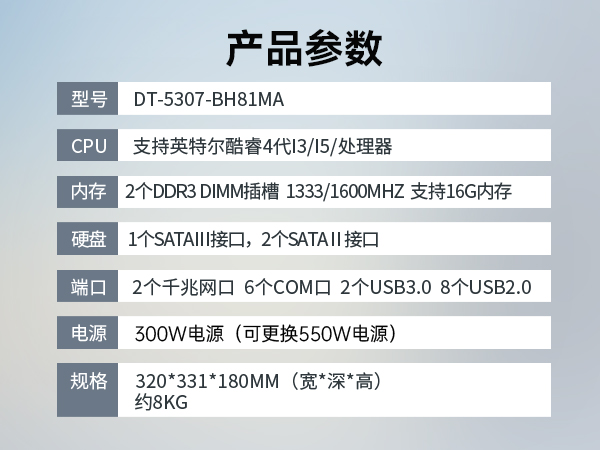 熊猫工控DT-5307-BH81MA是一款壁挂式工控机,采用酷睿4代13/15/17处理器,内存2个DDR3,支持16G。300W额定电源。单面出线,支持7个扩展槽,2个千兆网口,6个COM口,支持多种操作系统,欢迎定制。